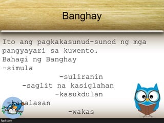 Banghay ng maikling kuwento 1. Maikling Kuwento Isang anyo ng panitikang nagsasalaysay sa madali maikli at masining na paraan. Saglit na Kasiglahan - naglalarawan ng pasimula tungo sa suliraning inihahanap ng lunas.
