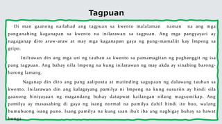 It won the prized Carlos Palanca Award in. Panimula Ang panitikang susuriin ay makling kuwento ang maikling kuwento ay isang maiksing salaysay na hango sa tunay na buhay o hindi II. Naghughugas ng kamay sa batalan si Impen nang kausapn at pangarlan siya ng kanyang ina.